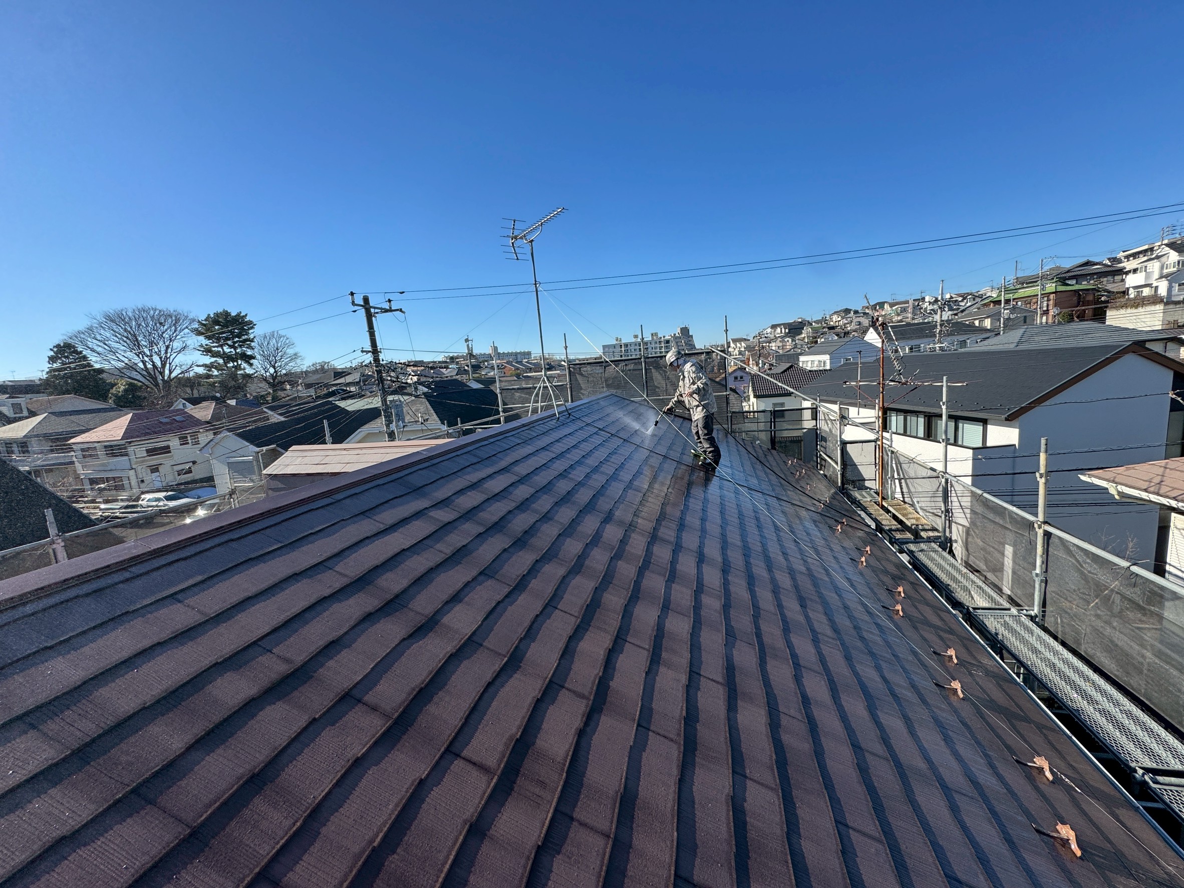 また、高圧洗浄では落ちない旧塗膜や錆はケレンで除去します。
