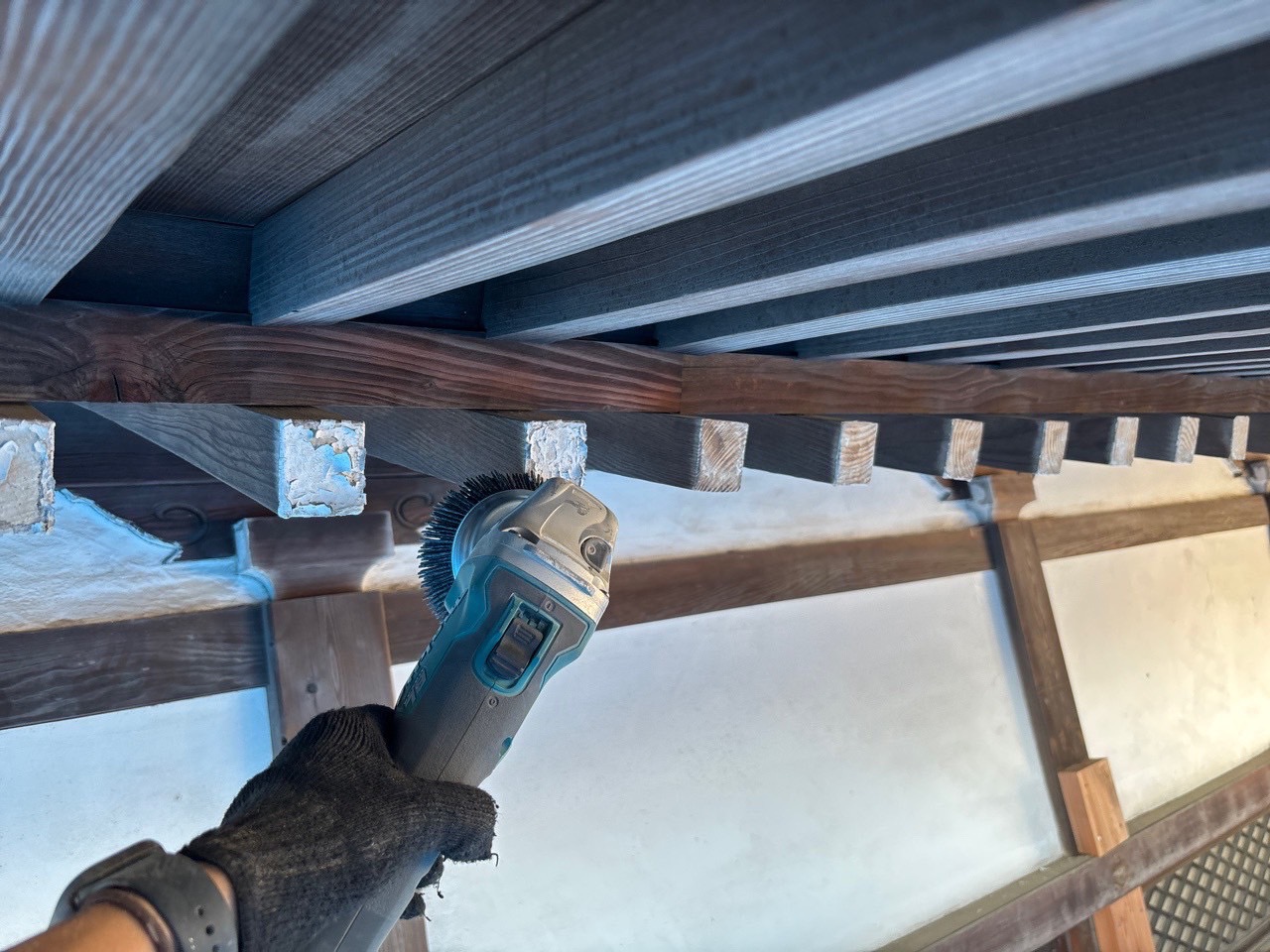 こちらは、サンダーにカップブラシをつけて、ケレン作業を行っている様子です。